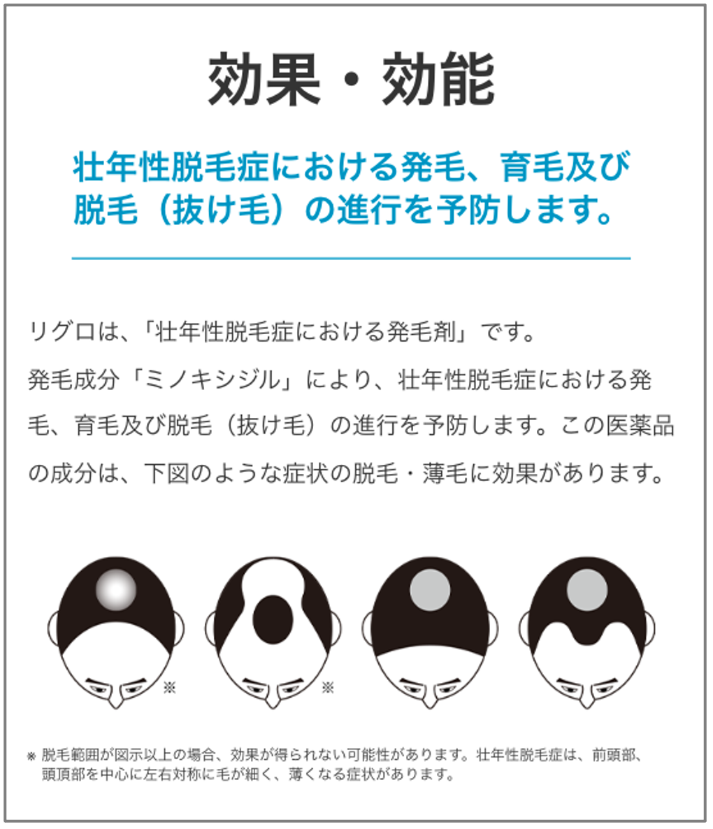 使用開始後6ヵ月以内であっても、脱毛状態の悪化や、次のような脱毛が見られた場合は、使用を中止し、製品の添付文書を持って医師又は薬剤師に相談してください。