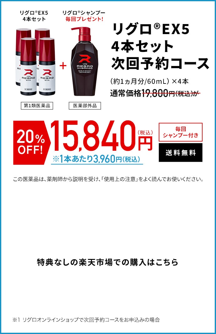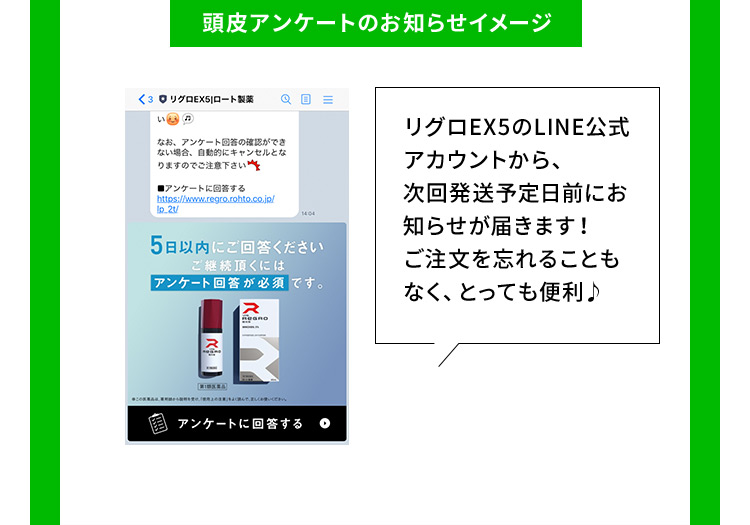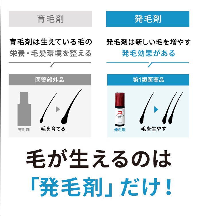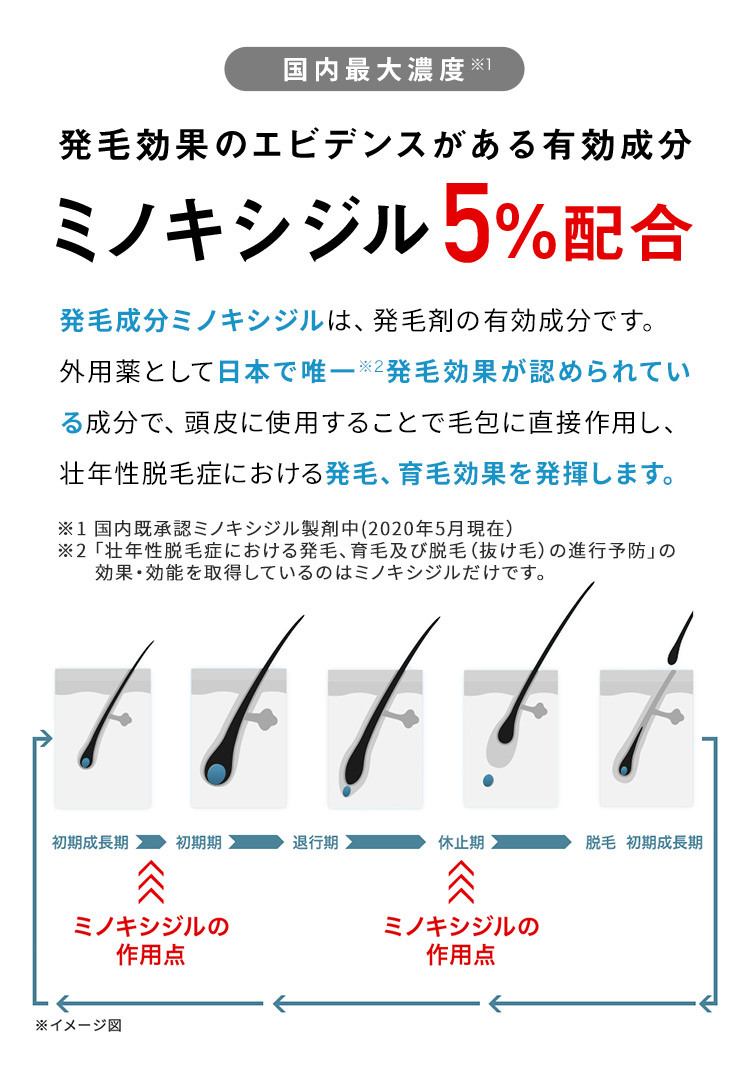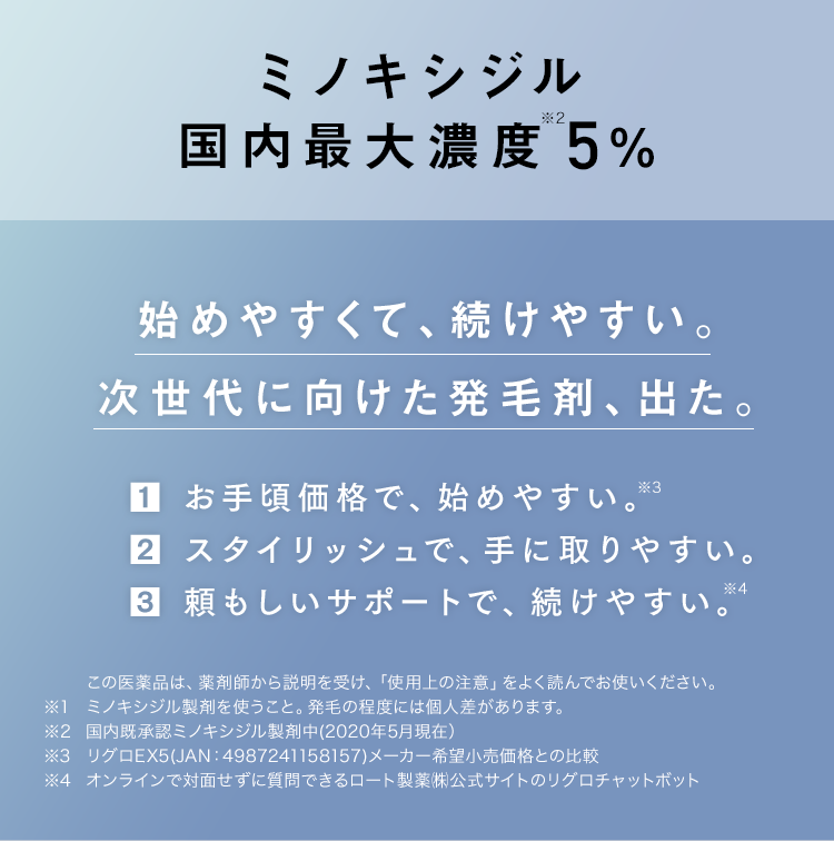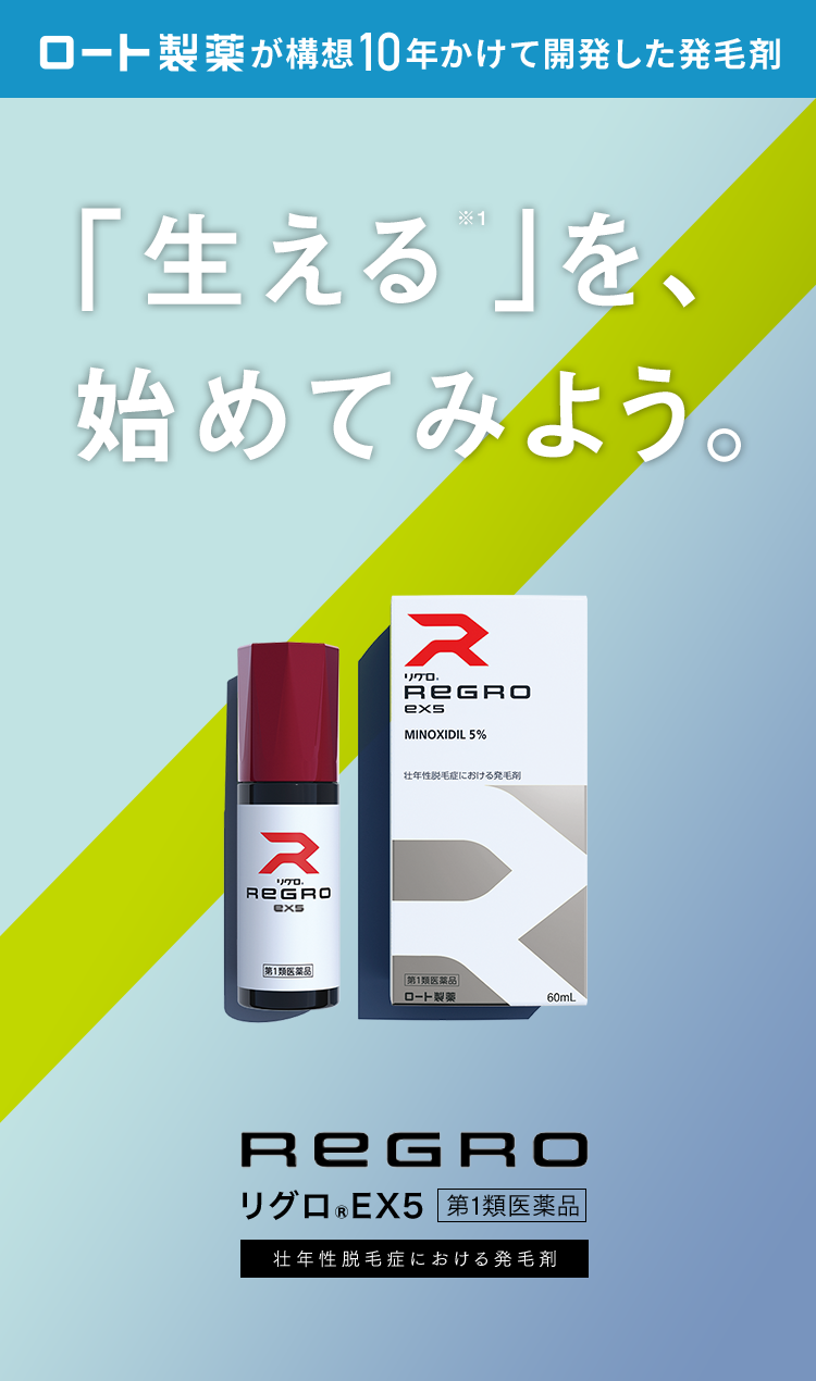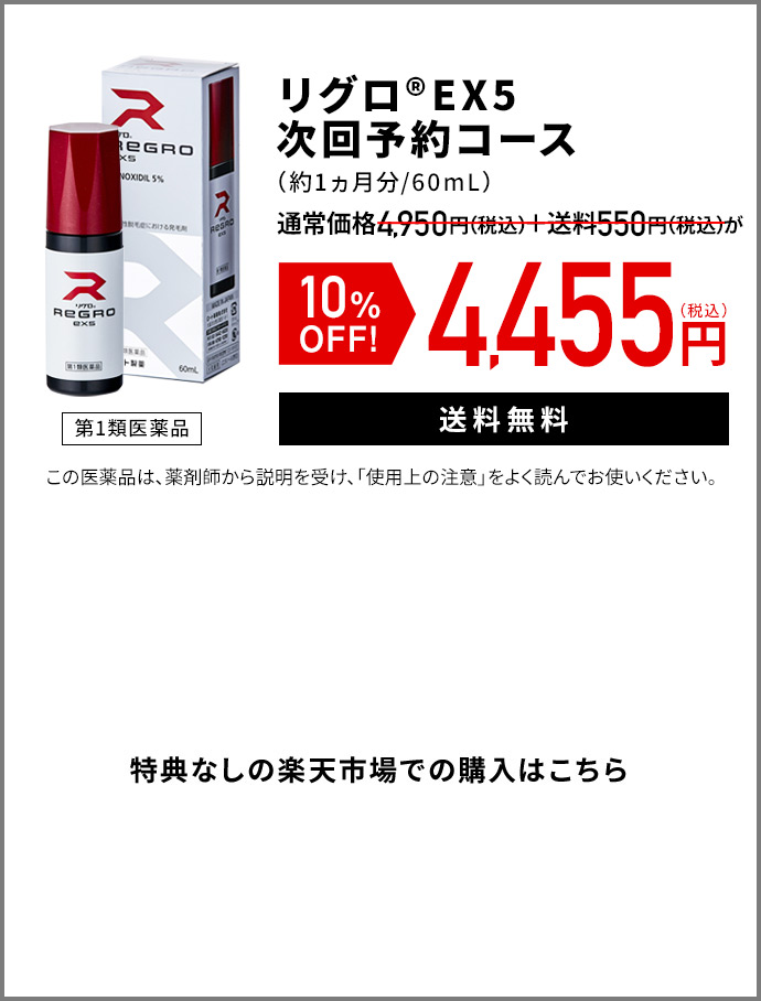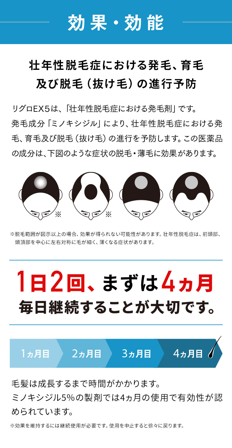 使用開始後6ヵ月以内であっても、脱毛状態の悪化や、次のような脱毛が見られた場合は、使用を中止し、製品の添付文書を持って医師又は薬剤師に相談してください。