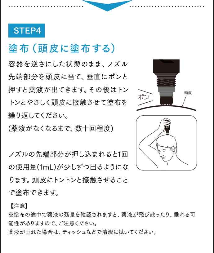 4.本剤を使用する場合は、他の育毛剤及び外用剤(軟膏、液剤等)の頭皮への使用は、避けてください。